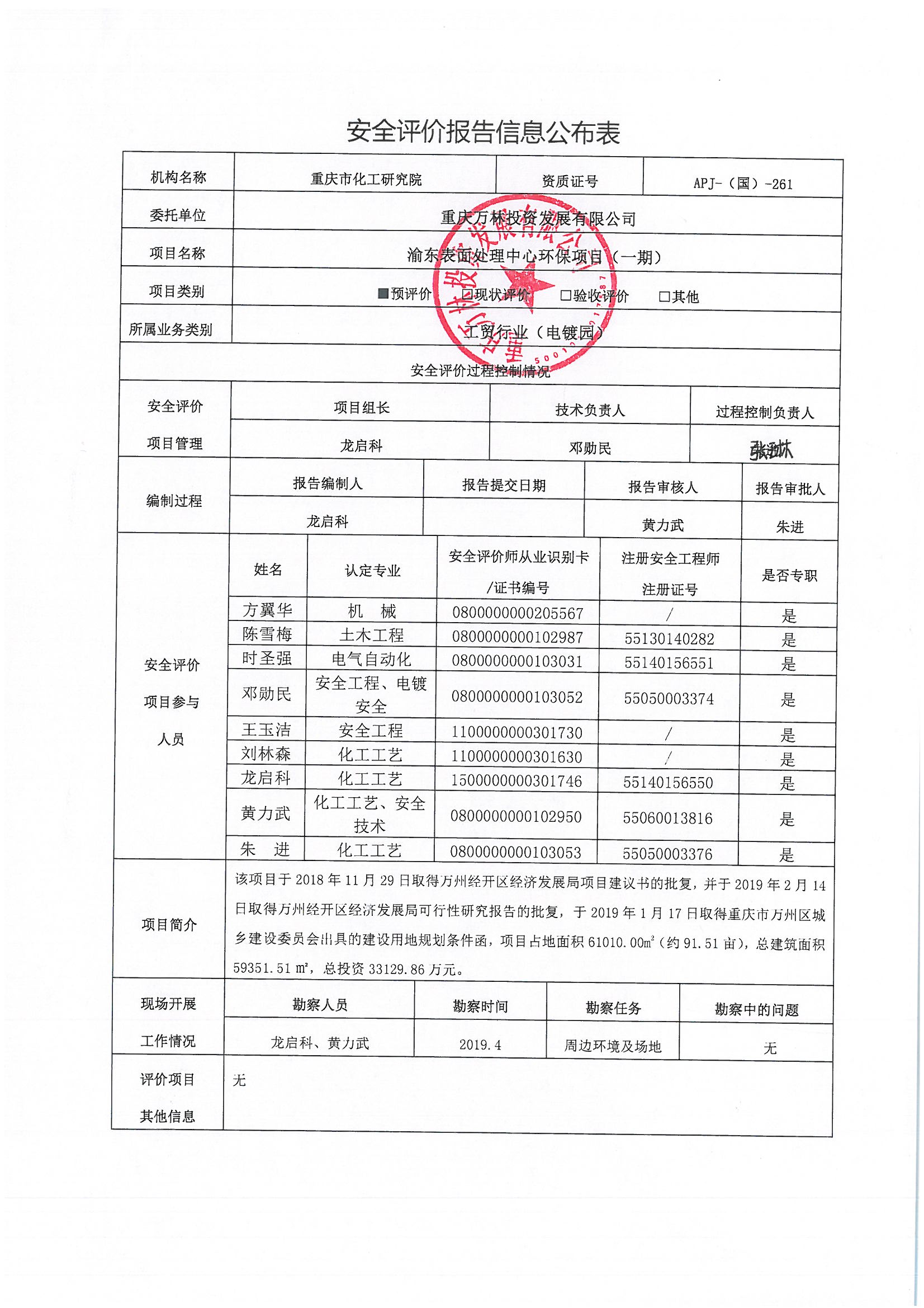 2019年第3季度重庆万林投资发展有限公司渝东表面处理中心环保项目(一期)预评价