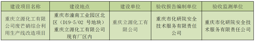 根据《国务院关于修改〈建设项目竣工环境保护管理条例〉的决定》(国务院令第682),以及生态环境部《关于发布<建设项目竣工环境保护验收暂行办法>的公告》(国环规环评[2017]4),现将“重庆立源化工有限公司废芒硝综合利用生产线改造项目”竣工环境保护验收公示如下: