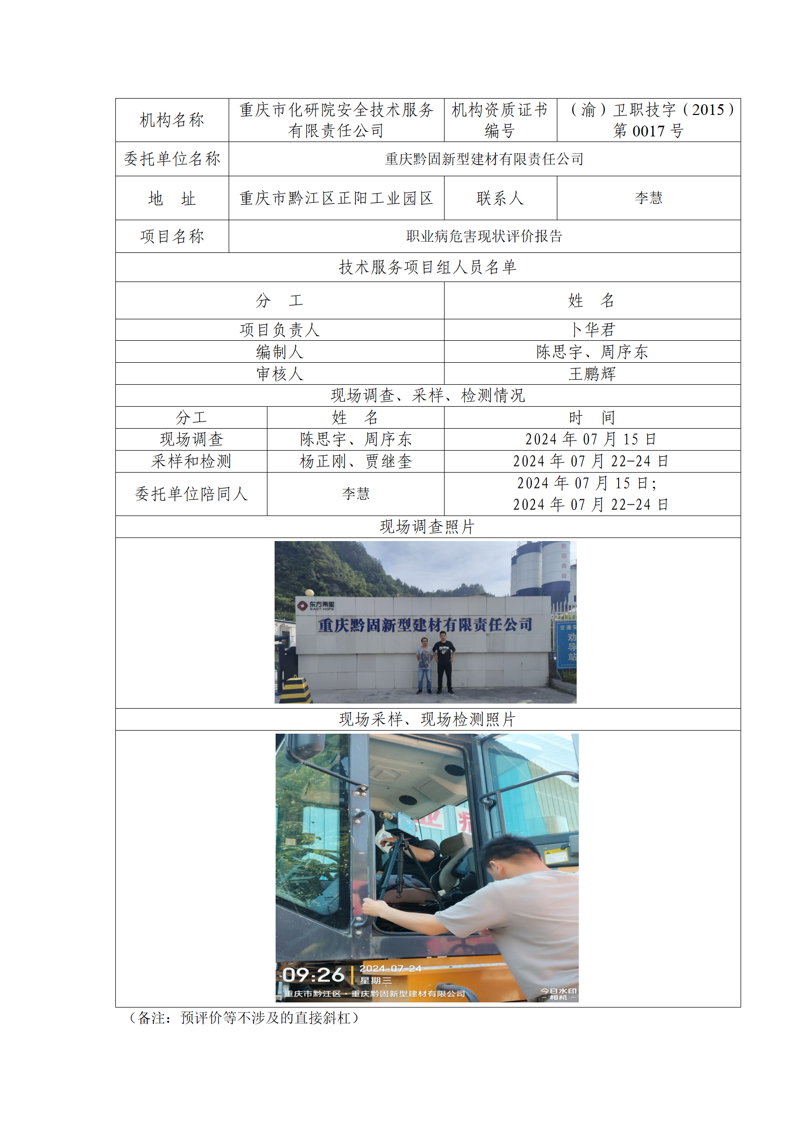 重庆黔固新型建材有限责任公司职业病危害现状评价报告