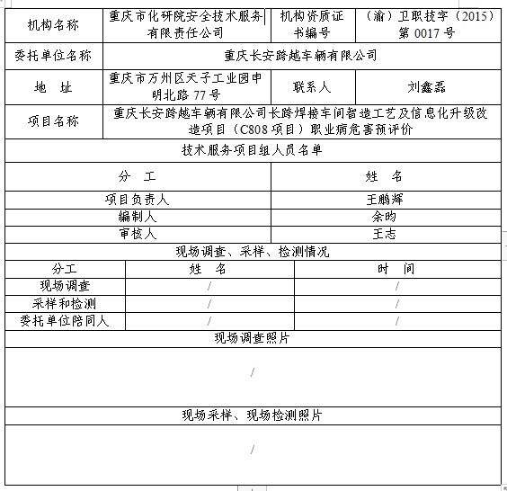 重庆长安跨越车辆有限公司长跨焊接车间智造工艺及信息化升级改造项目(C808项目)职业病危害预评价