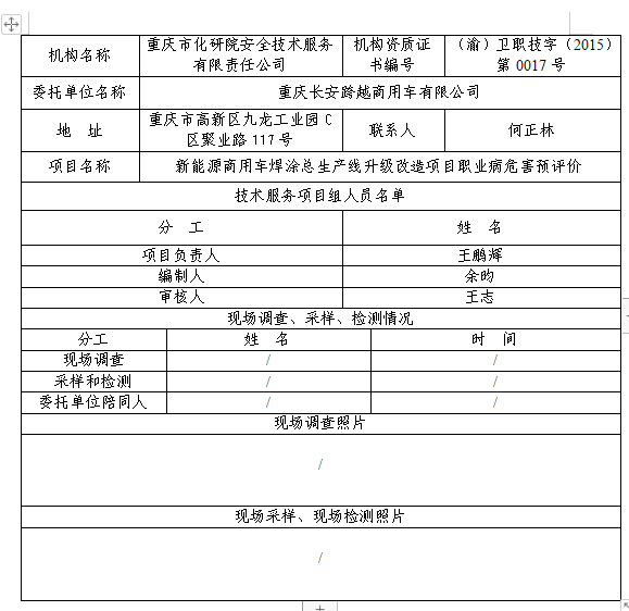 重庆长安跨越商用车有限公司新能源商用车焊涂总生产线升级改造项目职业病危害预评价