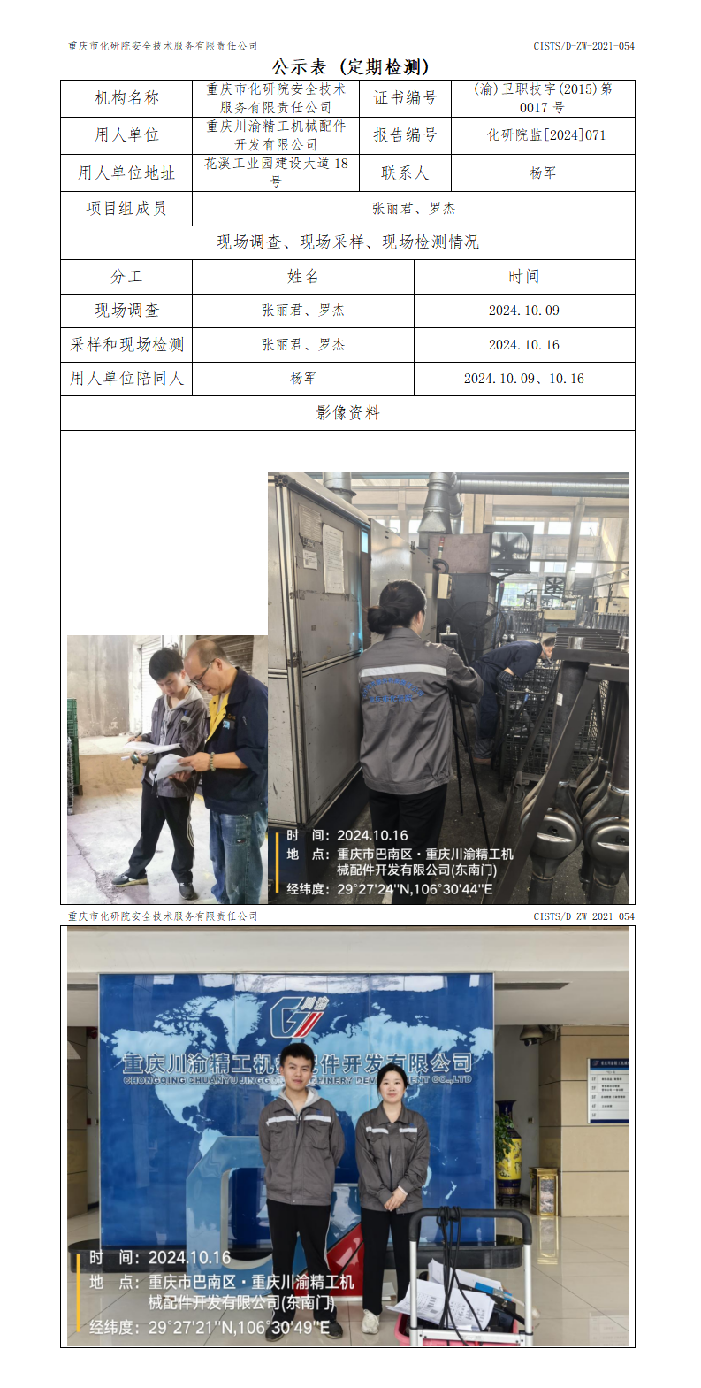 重庆川渝精工机械配件开发有限公司定期检测