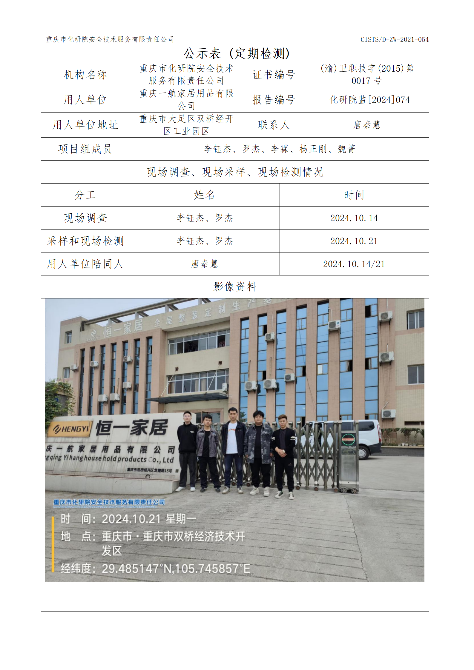 重庆一航家居用品有限公司定期检测