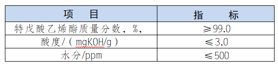 质量指标:符合重庆彩德网《特戊酸乙烯酯技术要求》(Q/ CHY16)。