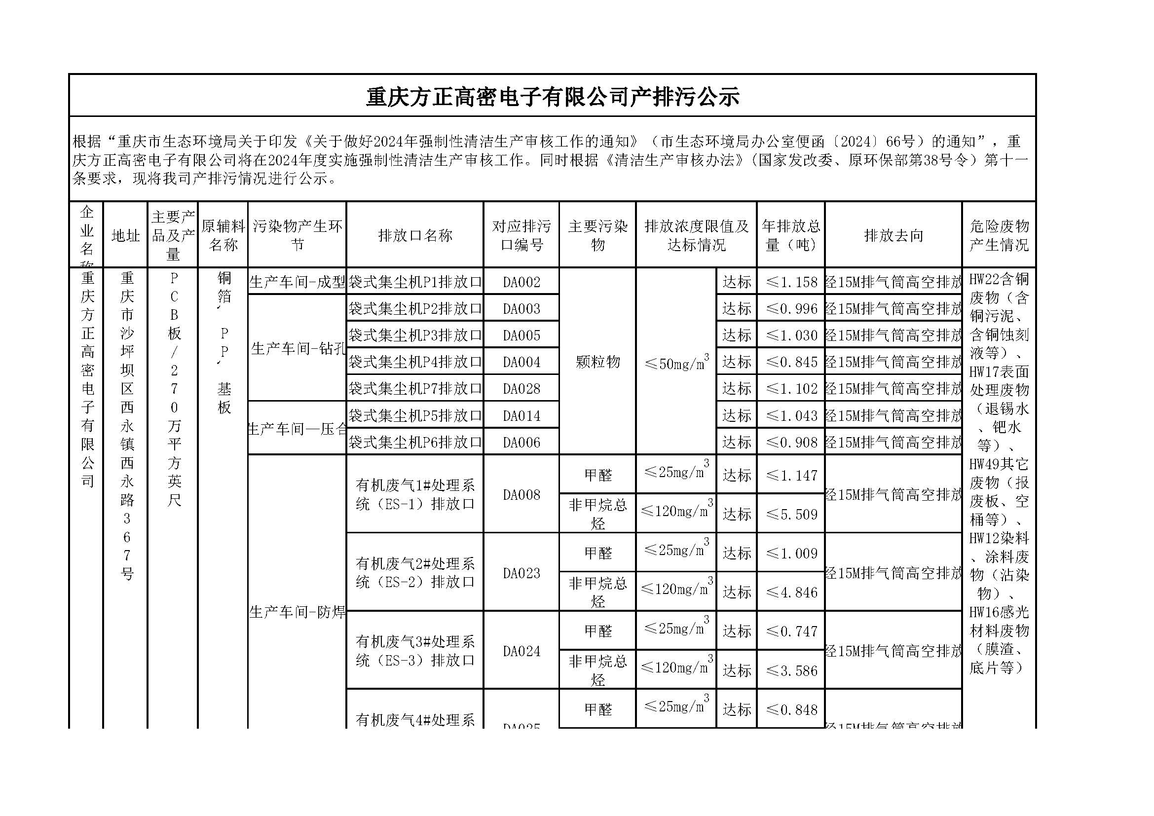 重庆方正高密电子有限公司产排污公示
