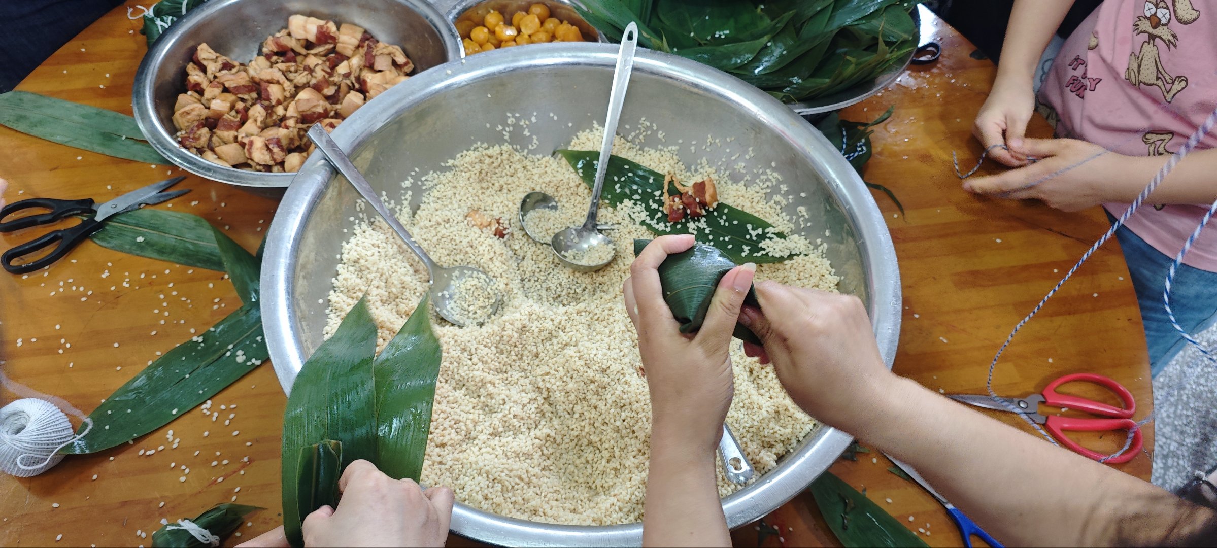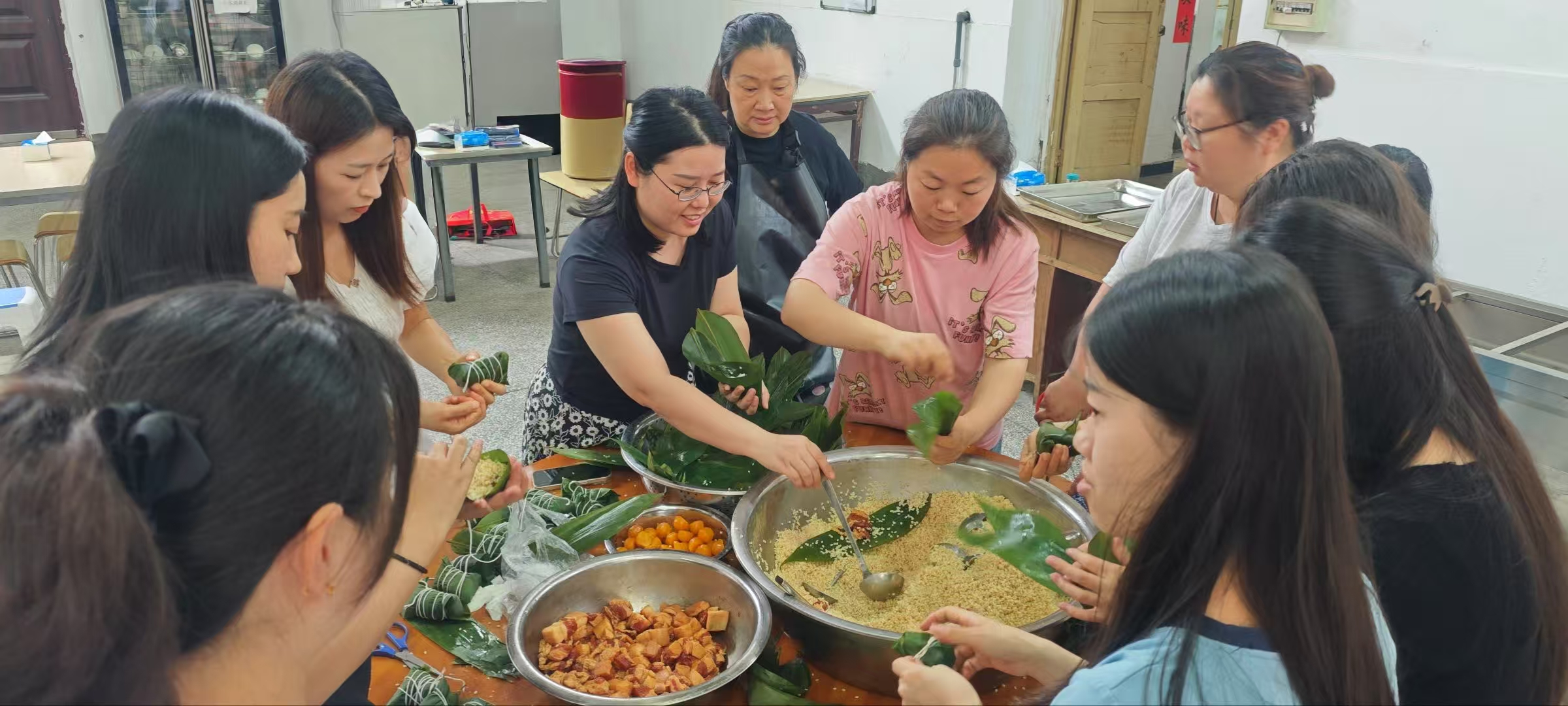 活动开始前,工会办公室提前布置好场地,准备了色泽鲜绿的粽叶、颗粒饱满的糯米、金黄诱人的咸蛋黄、肥瘦相间的五花肉,以及麻绳等包粽子所需材料。上午十点,员工们齐聚公司食堂,活动正式拉开帷幕。