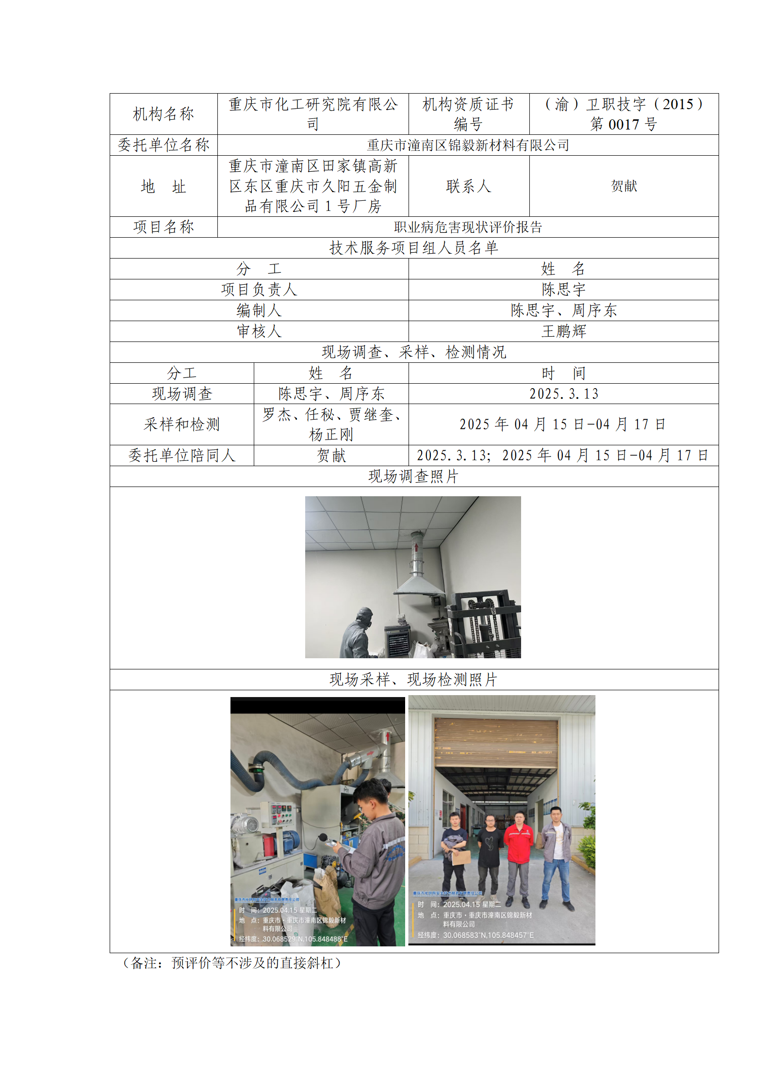重庆市潼南区锦毅新材料有限公司职业病危害现状评价